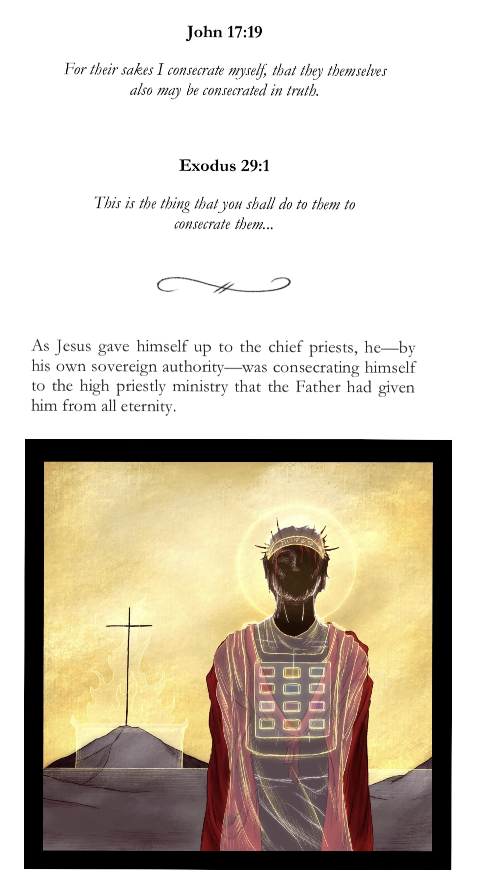 In John 17:19, Jesus speaks of His coming passion and death as a “consecration” that He enacts of His own power and will (similar to 10:18). There is much to say about Jesus’ “setting Himself apart” or “consecrating Himself” so that His followers also might be set apart/consecrated in truth (namely, the truth that is Himself as the revelation of the Father, which can only be fulfilled by making atonement on the cross), but what particularly caught my attention here—since I’ve been reading through Exodus lately—was the priestly connotation of the word “consecrate.”