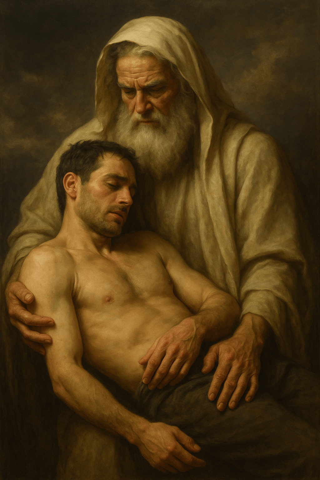God denied his request to remove the thorn. But He was not dispassionate about it. His “no” was not a rejection but a deeper “yes” to grace and strength—a loving invitation to experience His power made perfect in weakness, rather than deliverance from it. He graciously provided the comfort and strength that Paul needed, even if He would not take the hurt away. I see in this passage—and maybe I am reading too much into it, but I do not think so—I see in this passage the strong embrace of God, holding Paul, exposed and vulnerable…like the man in the picture.